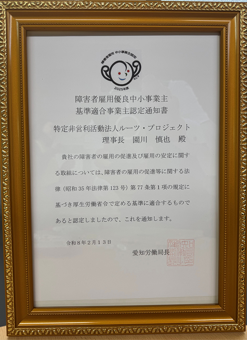 こうしたことを検討した結果、私たちは、障がい者、とりわけ就労意欲のある障がい者に対して、障害者の日常生活及び社会生活を総合的に支援する法律に基づく障害福祉サービス事業を行う目的で、特定非営利活動法人ルーツ・プロジェクトを設立いたしました。