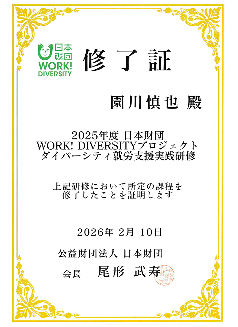 日本財団主催の「ダイバーシティ就労支援実践研修」を修了しました。